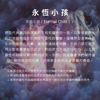 永恆小孩(Eternal Child): 永恆小孩原型代表著內心深處的永恆和靈性的一面。它象徵著對生命的奇蹟和存在的無限可能性的體驗。這種原型通常與對生命的敬畏、玩樂、喜悅和連結感有關。永恆小孩可能表現出對美麗事物的追求、對自然和宇宙的好奇心,以及對靈性和超越物質世界的追求。永恆小孩提醒著我們保持童心、保持開放的心態,並探索生命的深層意義和價值。